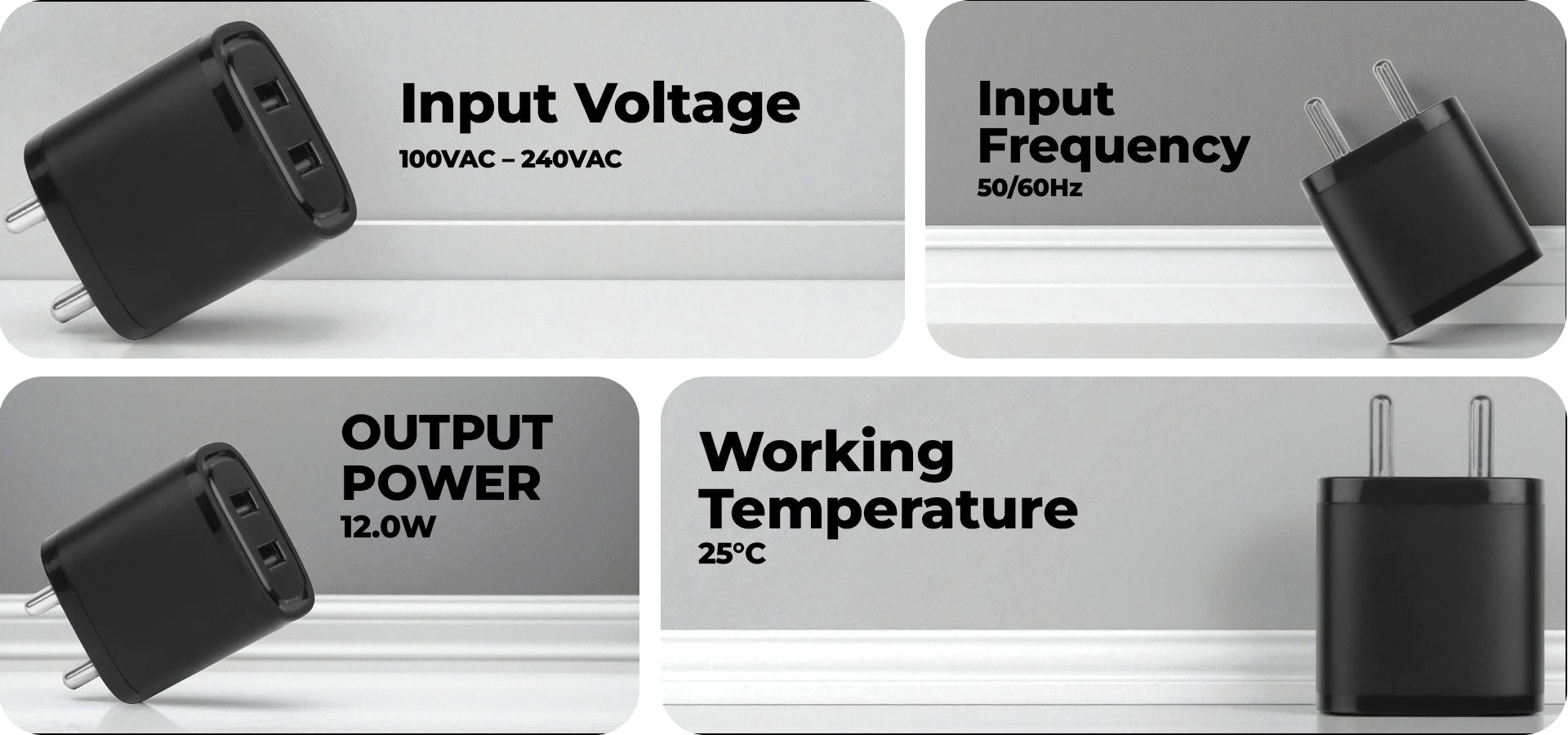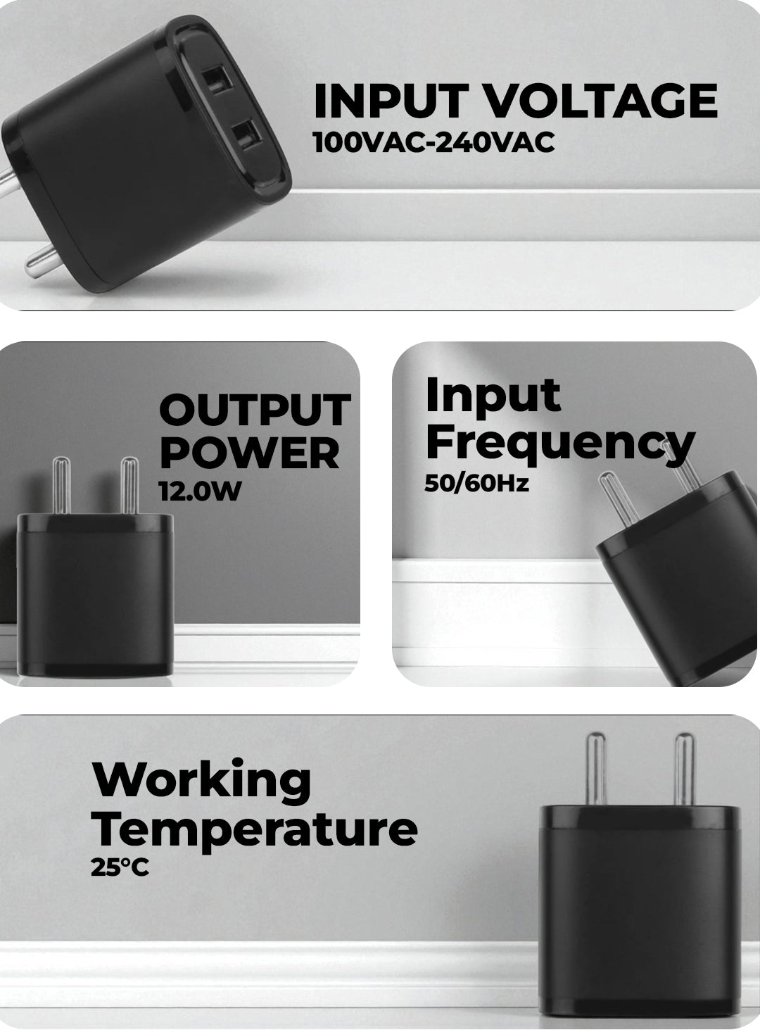 INPUT VOLTAGE : 100VAC-240VAC INPUT FREQUENCY : 50/60HZ OUTPUT VOLTAGE DC (TYPE-C) : 5V/ 9V/ 12V OUTPUT CURRENT DC (TYPE-C) : 3.0A/ 2.2A/ 1.7A OUTPUT POWER : 12.0W (MAX.) OUTPUT RIPPLE & NOISE : <200MV WORKING TEMEPRETURE : 25 DEGREE AGING TEST : 40MIN. FULL LOAD