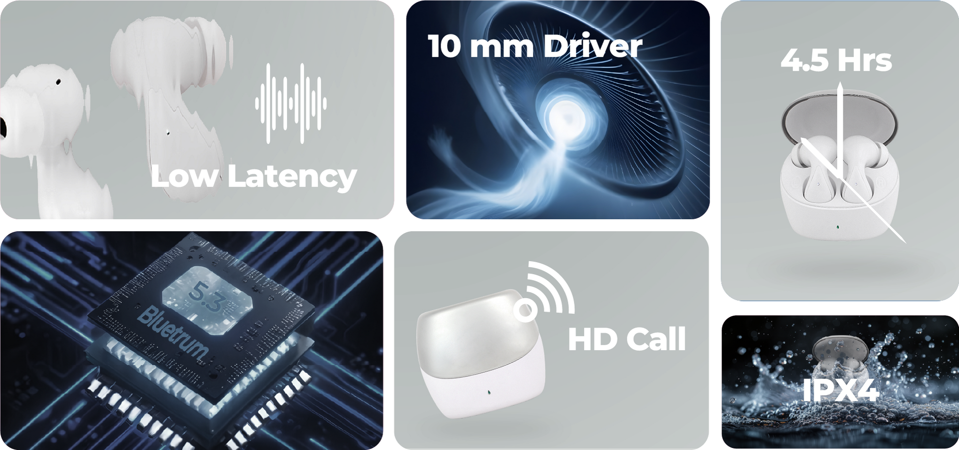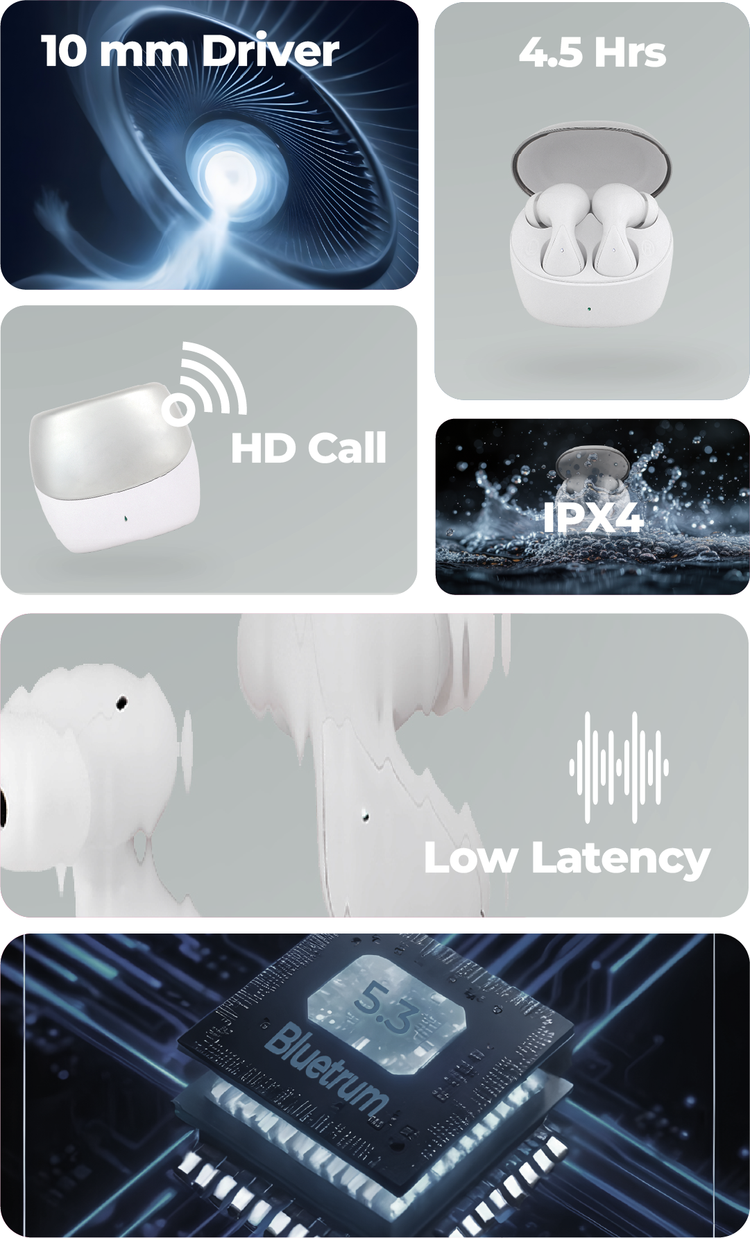 Bluetooth Version: V5.3 ,Profile support: Harmony OS, Android, IOS and so on ,Chipset: Airoha/Bluetrum, Driver Size: 10mm, Frequency Range: 20-20000HZ ,Operation Range: 10m ,Earphone/Charging box capacity: 200MAH Ear part: 25MAH ,Playing Time: 4 hrs ,Talking Time: 4.5 hrs ,Charging Time: 1.3H Ear part: 1H ,Standby Time: 2000 H, Waterproof Level: IPX4